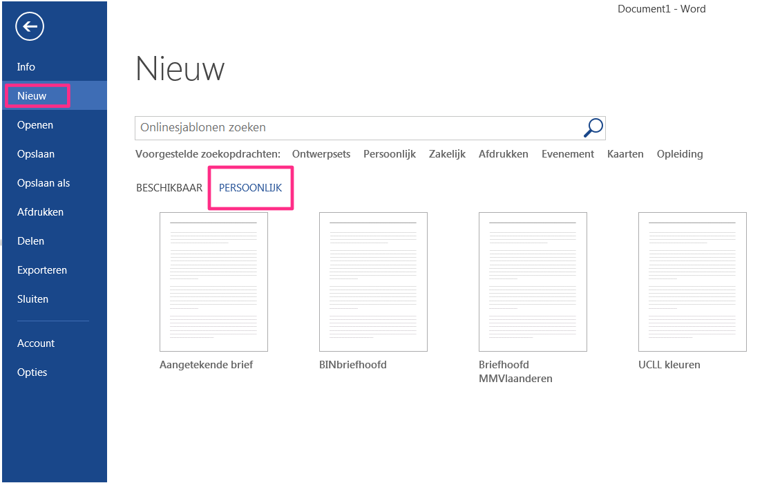 Vervolgens kies je in het linker menu Nieuw. Je ziet dan rechts de door Office beschikbare sjablonen. Als je op Persoonlijk klikt kan je je eigen sjablonen terug vinden: